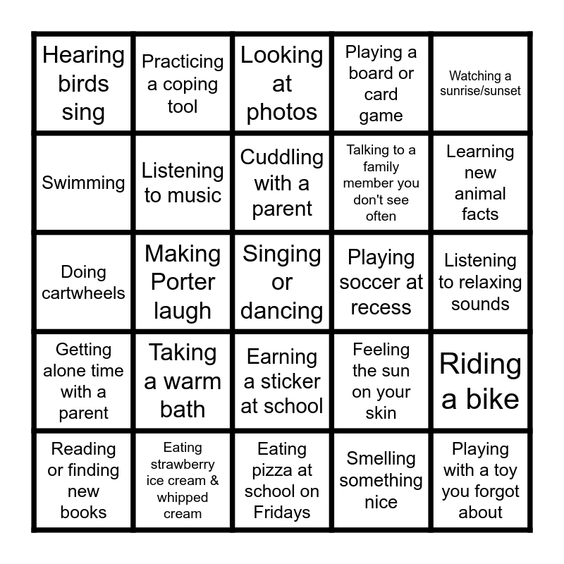This bingo card has a free space and 24 words: Taking a warm bath, Eating strawberry ice cream & whipped cream, Cuddling with a parent, Reading or finding new books, Watching a sunrise/sunset, Hearing birds sing, Swimming, Practicing a coping tool, Playing soccer at recess, Earning a sticker at school, Talking to a family member you don't see often, Doing cartwheels, Feeling the sun on your skin, Riding a bike, Listening to music, Smelling something nice, Listening to relaxing sounds, Looking at photos, Learning new animal facts, Making Porter laugh, Playing with a toy you forgot about, Getting alone time with a parent, Playing a board or card game and Eating pizza at school on Fridays.
