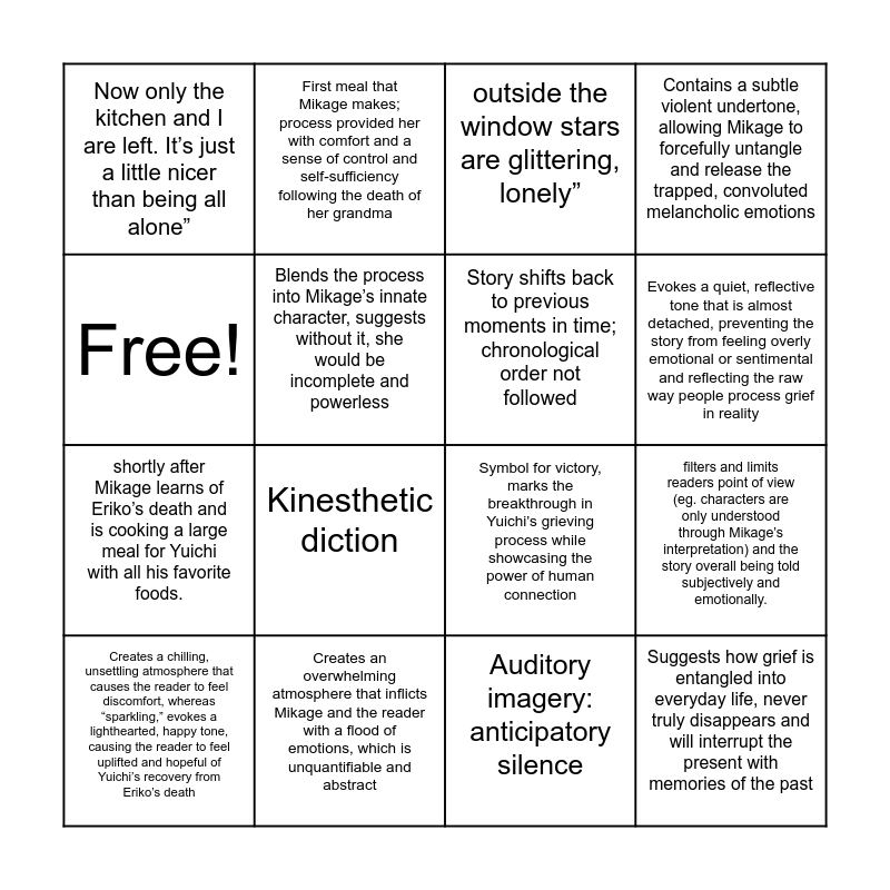 This bingo card has 16 words: Creates an overwhelming atmosphere that inflicts Mikage and the reader with a flood of emotions, which is unquantifiable and abstract, filters and limits readers point of view (eg. characters are only understood through Mikage’s interpretation) and the story overall being told subjectively and emotionally., outside the window stars are glittering, lonely”, Now only the kitchen and I are left. It’s just a little nicer than being all alone”, shortly after Mikage learns of Eriko’s death and is cooking a large meal for Yuichi with all his favorite foods., First meal that Mikage makes; process provided her with comfort and a sense of control and self-sufficiency following the death of her grandma, Symbol for victory, marks the breakthrough in Yuichi’s grieving process while showcasing the power of human connection, Auditory imagery: anticipatory silence, Free!, Blends the process into Mikage’s innate character, suggests without it, she would be incomplete and powerless, Creates a chilling, unsettling atmosphere that causes the reader to feel discomfort, whereas “sparkling,” evokes a lighthearted, happy tone, causing the reader to feel uplifted and hopeful of Yuichi’s recovery from Eriko’s death, Contains a subtle violent undertone, allowing Mikage to forcefully untangle and release the trapped, convoluted melancholic emotions, Kinesthetic diction, Evokes a quiet, reflective tone that is almost detached, preventing the story from feeling overly emotional or sentimental and reflecting the raw way people process grief in reality, Story shifts back to previous moments in time; chronological order not followed and Suggests how grief is entangled into everyday life, never truly disappears and will interrupt the present with memories of the past.