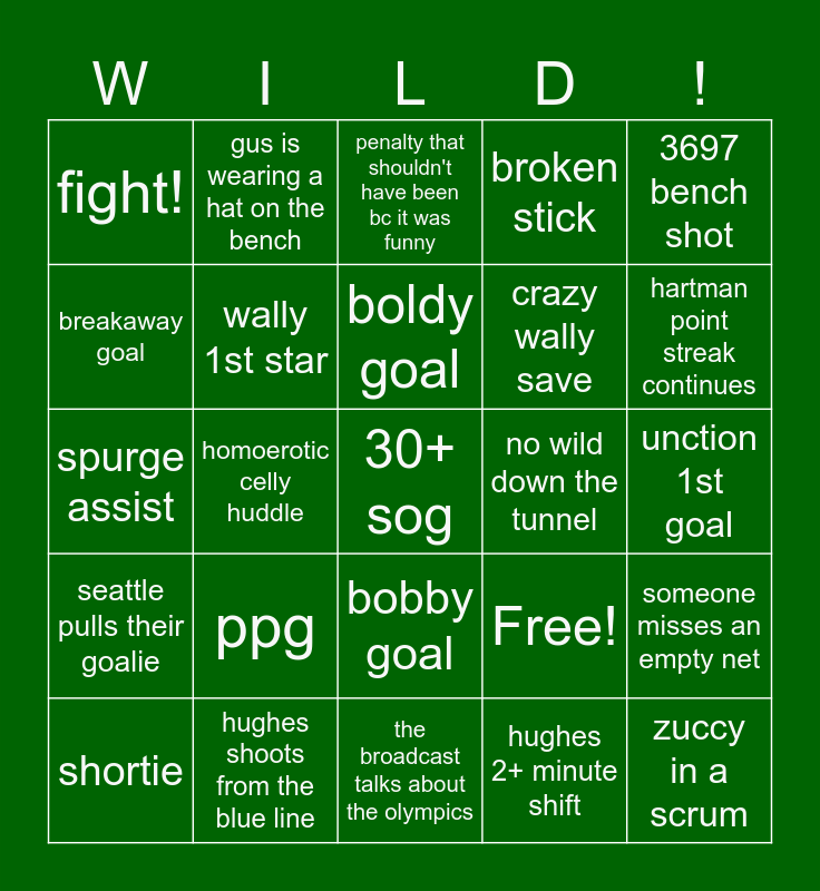This bingo card has 25 words: ppg, the broadcast talks about the olympics, boldy goal, shortie, 3697 bench shot, fight!, breakaway goal, gus is wearing a hat on the bench, no wild down the tunnel, bobby goal, crazy wally save, spurge assist, Free!, someone misses an empty net, wally 1st star, zuccy in a scrum, unction 1st goal, penalty that shouldn't have been bc it was funny, hartman point streak continues, homoerotic celly huddle, 30+ sog, hughes shoots from the blue line, seattle pulls their goalie, broken stick and hughes 2+ minute shift.