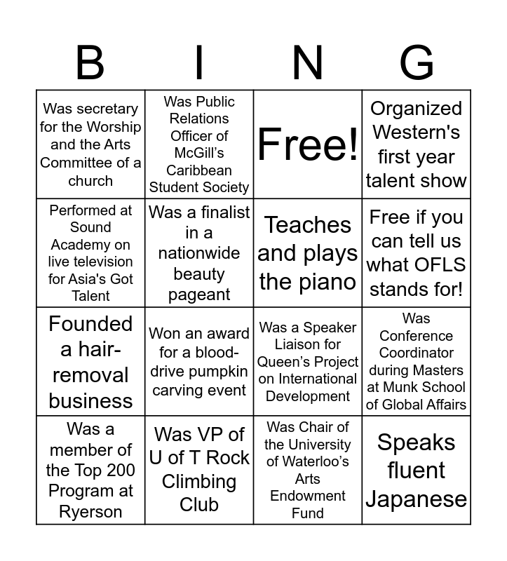 This bingo card has 16 words: Was VP of U of T Rock Climbing Club, Was Conference Coordinator during Masters at Munk School of Global Affairs, Free!, Was secretary for the Worship and the Arts Committee of a church, Founded a hair-removal business, Was Public Relations Officer of McGill’s Caribbean Student Society, Was a Speaker Liaison for Queen’s Project on International Development, Was Chair of the University of Waterloo’s Arts Endowment Fund, Performed at Sound Academy on live television for Asia's Got Talent, Was a finalist in a nationwide beauty pageant, Was a member of the Top 200 Program at Ryerson, Organized Western's first year talent show, Won an award for a blood-drive pumpkin carving event, Free if you can tell us what OFLS stands for!, Teaches and plays the piano and Speaks fluent Japanese.