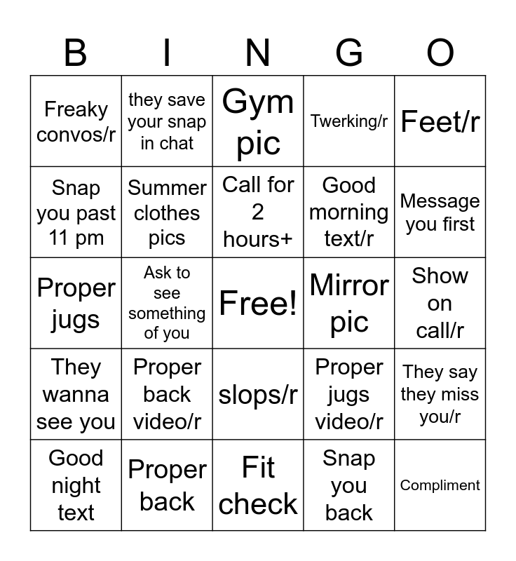 This bingo card has a free space and 24 words: Proper back video/r, Proper back, Call for 2 hours+, Good night text, Feet/r, Freaky convos/r, Snap you past 11 pm, they save your snap in chat, Mirror pic, slops/r, Good morning text/r, Proper jugs, Proper jugs video/r, They say they miss you/r, Summer clothes pics, Snap you back, Show on call/r, Gym pic, Message you first, Ask to see something of you, Compliment, They wanna see you, Twerking/r and Fit check.