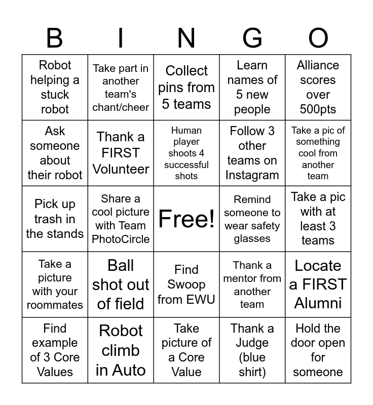 This bingo card has a free space and 24 words: Ball shot out of field, Robot climb in Auto, Human player shoots 4 successful shots, Find example of 3 Core Values, Alliance scores over 500pts, Robot helping a stuck robot, Ask someone about their robot, Take part in another team's chant/cheer, Remind someone to wear safety glasses, Find Swoop from EWU, Follow 3 other teams on Instagram, Pick up trash in the stands, Thank a mentor from another team, Locate a FIRST Alumni, Thank a FIRST Volunteer, Thank a Judge (blue shirt), Take a pic with at least 3 teams, Collect pins from 5 teams, Take a pic of something cool from another team, Share a cool picture with Team PhotoCircle, Hold the door open for someone, Take a picture with your roommates, Learn names of 5 new people and Take picture of a Core Value.