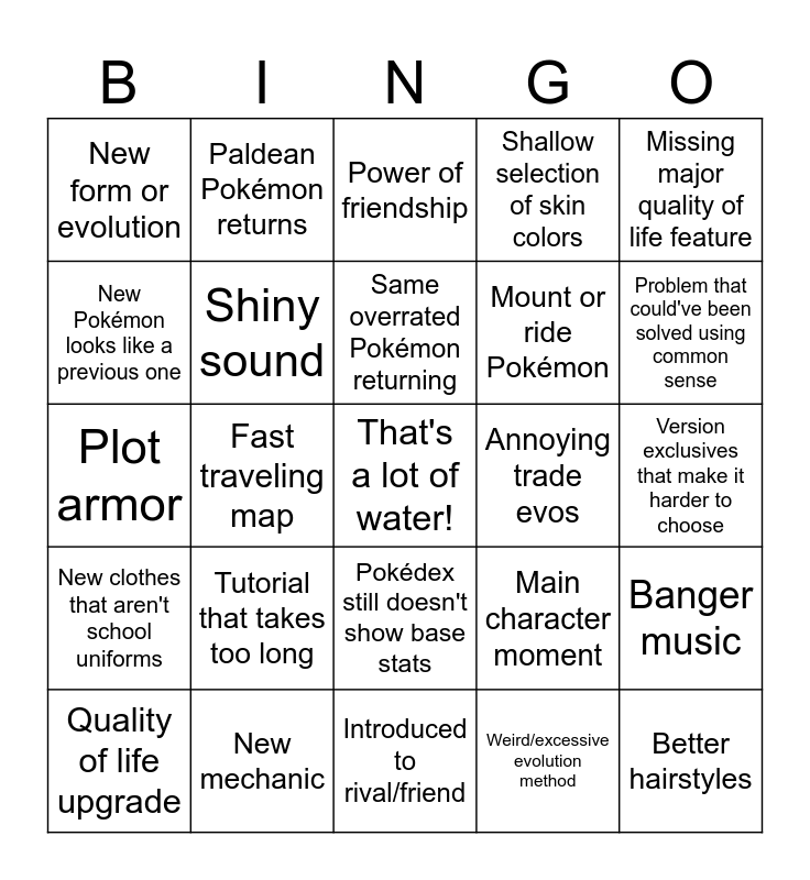 This bingo card has a free space and 24 words: Tutorial that takes too long, New mechanic, Same overrated Pokémon returning, Quality of life upgrade, Missing major quality of life feature, New form or evolution, New Pokémon looks like a previous one, Paldean Pokémon returns, Annoying trade evos, Pokédex still doesn't show base stats, Mount or ride Pokémon, Plot armor, Main character moment, Banger music, Shiny sound, Weird/excessive evolution method, Version exclusives that make it harder to choose, Power of friendship, Problem that could've been solved using common sense, Fast traveling map, Better hairstyles, New clothes that aren't school uniforms, Shallow selection of skin colors and Introduced to rival/friend.