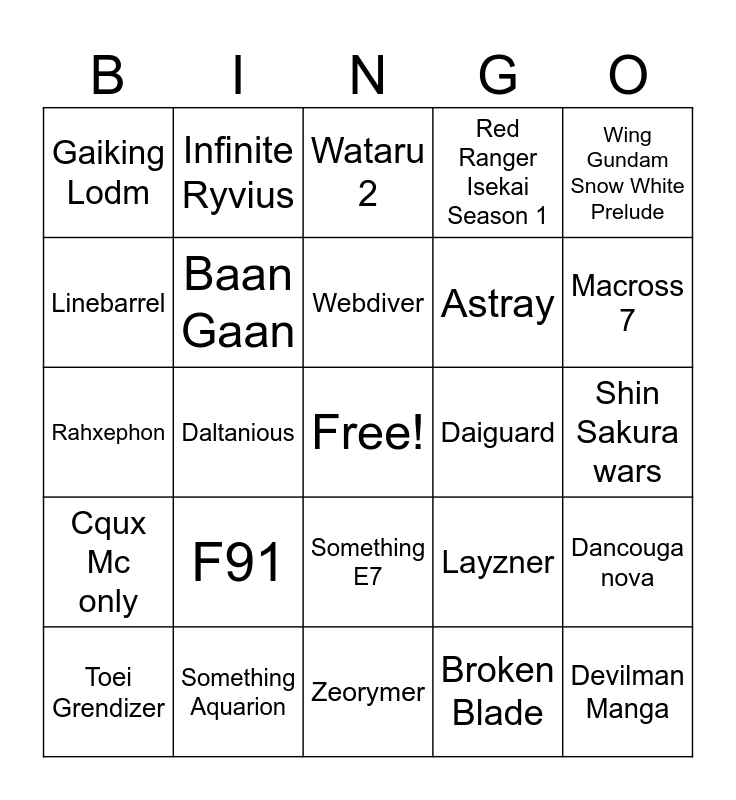 This bingo card has a free space and 24 words: Toei Grendizer, F91, Webdiver, Broken Blade, Wing Gundam Snow White Prelude, Gaiking Lodm, Infinite Ryvius, Wataru 2, Daiguard, Shin Sakura wars, Rahxephon, Baan Gaan, Layzner, Dancouga nova, Linebarrel, Something Aquarion, Zeorymer, Red Ranger Isekai Season 1, Macross 7, Cqux Mc only, Daltanious, Something E7, Astray and Devilman Manga.