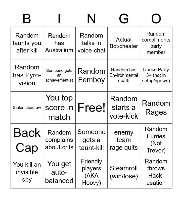 This bingo card has a free space and 30 words: You get auto-balanced, Random says racial Slurs in Chat, You top score in match, 3 random snipers/spies on team, Random taunts you after kill, Random talks in voice-chat, Someone gets an achievement(s), Someone gets a taunt-kill, Random starts a vote-kick, Friendly players (AKA Hoovy), Random Rages, Random throws Hack-usation, Steamroll (win/lose), You dominate an enemy, Dance Party 3+ (not in setup/spawn), 2+ enemy mini-sentries, enemy team rage quits, Back Cap, Random complains about crits, Random compliments party member, Stalemate/draw, Spawncamping, Random has Australium, Random has Environmental death, Random has Pyro-vision, Actual Bot/cheater, Random Furries (Not Trevor), You kill an invisible spy, Random Femboy and Random types Offensive Chat.