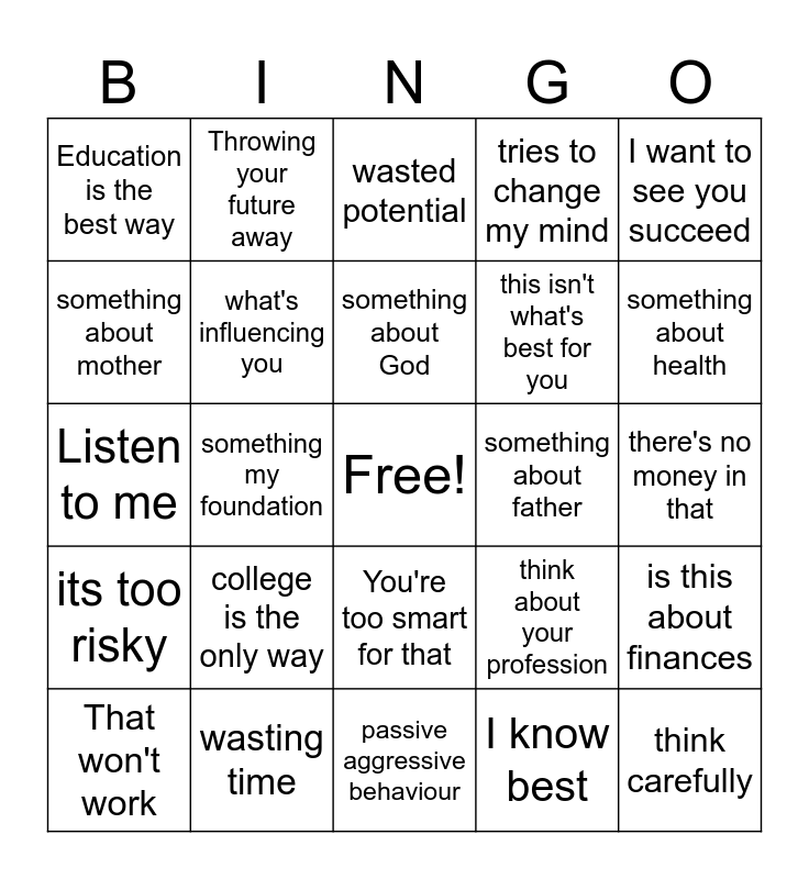 This bingo card has a free space and 24 words: That won't work, college is the only way, something about God, I know best, I want to see you succeed, Education is the best way, Throwing your future away, wasted potential, something about father, there's no money in that, Listen to me, what's influencing you, think about your profession, is this about finances, something about mother, wasting time, passive aggressive behaviour, tries to change my mind, something about health, its too risky, something my foundation, You're too smart for that, this isn't what's best for you and think carefully.