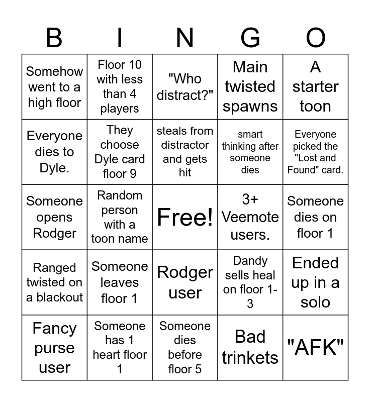 This bingo card has a free space and 24 words: Fancy purse user, Someone leaves floor 1, steals from distractor and gets hit, Bad trinkets, A starter toon, Somehow went to a high floor, Floor 10 with less than 4 players, "Who distract?", 3+ Veemote users., Someone dies on floor 1, Someone opens Rodger, They choose Dyle card floor 9, Dandy sells heal on floor 1-3, Ended up in a solo, Everyone dies to Dyle., Someone has 1 heart floor 1, Someone dies before floor 5, Main twisted spawns, Everyone picked the "Lost and Found" card., Ranged twisted on a blackout, Random person with a toon name, Rodger user, smart thinking after someone dies and "AFK".