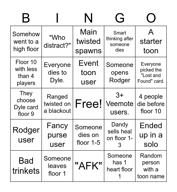 This bingo card has a free space and 24 words: Fancy purse user, Someone leaves floor 1, Event toon user, Bad trinkets, A starter toon, Somehow went to a high floor, Floor 10 with less than 4 players, "Who distract?", 3+ Veemote users., Someone dies on floor 1-5, Someone opens Rodger, They choose Dyle card floor 9, Dandy sells heal on floor 1-3, Ended up in a solo, Everyone dies to Dyle., Someone has 1 heart floor 1, 4 people die before floor 10, Main twisted spawns, Everyone picked the "Lost and Found" card., Ranged twisted on a blackout, Random person with a toon name, Rodger user, Smart thinking after someone dies and "AFK".