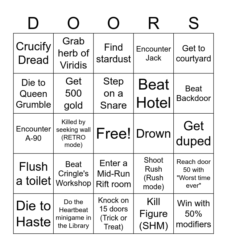 This bingo card has a free space and 46 words: Encounter Sally, Win with 50% modifiers, Die to Hide, Knock on 15 doors (Trick or Treat), Beat Cringle's Workshop, Reach door 60 (SHM), Grab herb of Viridis, Crucify an entity, Die to Queen Grumble, Distract Figure with an alarm clock, Get 500 gold, Encounter Jack, Reach door 50 with "Worst time ever", Shoot Rush (Rush mode), Survive Surge while taking damage, Use a lockpick on a generator, Step on a Snare, Drown, Barter with Louie, Get to courtyard, Killed by seeking wall (RETRO mode), Kill Figure (SHM), Crucify Dread, Beat Hotel, Beat Mines, Beat Backdoor, Die to Haste, Enter Rooms, Enter a Mid-Run Rift room, Flush a toilet, Hide from an entity in a dumpster, Hide from an entity without a closet or bed, 1k points (Battle mode), Grabbed by Seek hand, Get a Lotus, Do the Heartbeat minigame in the Library, Get duped, Get to Jeff without using items (keys/fuses and books allowed), Get Starlight Rift, Go through a dark room w/o Screech, Complete a daily run, Find stardust, Encounter A-90, Use 3 lockpicks, Use all durability on a Lighter and Light Firedamp (Battle mode).