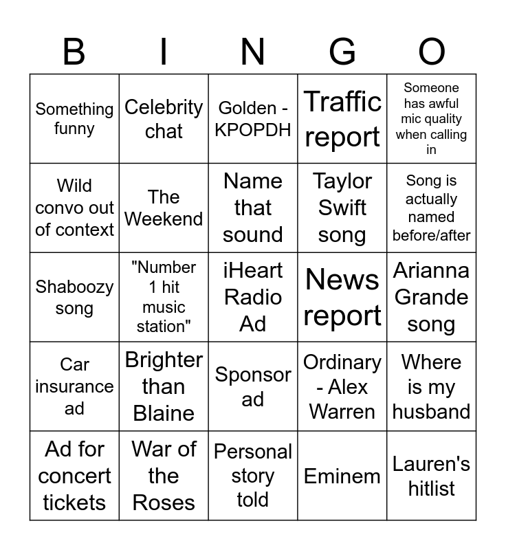 This bingo card has a free space and 24 words: Brighter than Blaine, War of the Roses, Name that sound, Ad for concert tickets, Someone has awful mic quality when calling in, Something funny, Wild convo out of context, Celebrity chat, News report, Sponsor ad, Taylor Swift song, Shaboozy song, Ordinary - Alex Warren, Where is my husband, The Weekend, Eminem, Arianna Grande song, Golden - KPOPDH, Song is actually named before/after, "Number 1 hit music station", Lauren's hitlist, Car insurance ad, Traffic report and Personal story told.