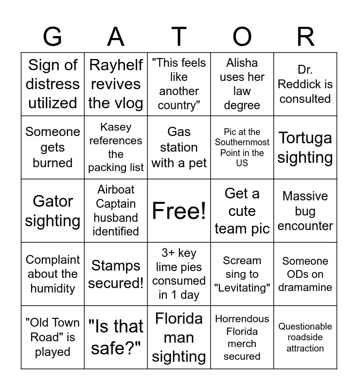 This bingo card has a free space and 24 words: Stamps secured!, "Is that safe?", Gas station with a pet, "Old Town Road" is played, Dr. Reddick is consulted, Sign of distress utilized, Someone gets burned, Rayhelf revives the vlog, Get a cute team pic, 3+ key lime pies consumed in 1 day, Pic at the Southernmost Point in the US, Gator sighting, Scream sing to "Levitating", Someone ODs on dramamine, Kasey references the packing list, Horrendous Florida merch secured, Massive bug encounter, "This feels like another country", Tortuga sighting, Airboat Captain husband identified, Questionable roadside attraction, Complaint about the humidity, Alisha uses her law degree and Florida man sighting.