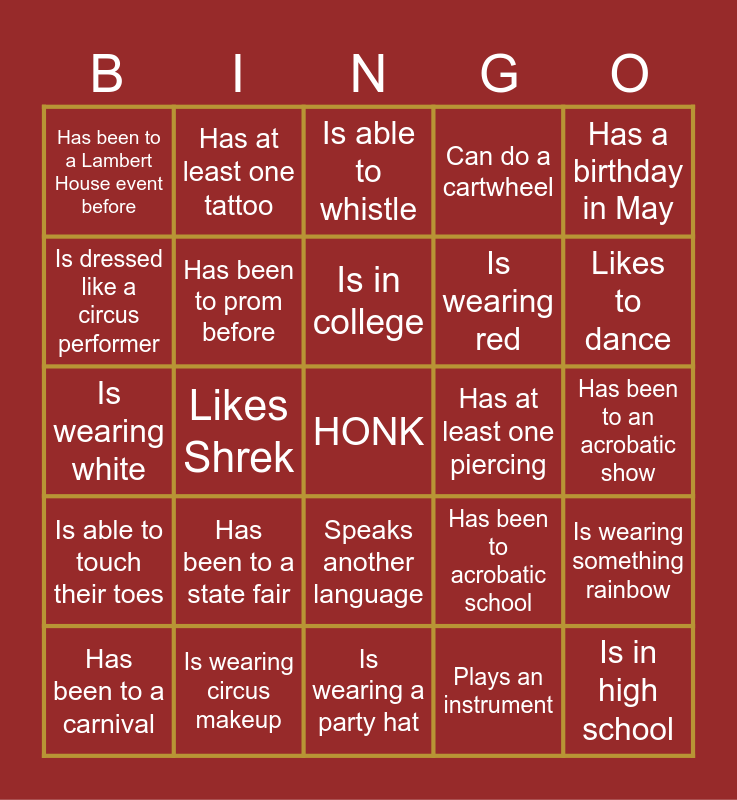 This bingo card has a free space and 24 words: Has been to a state fair, Is wearing circus makeup, Is in college, Has been to a carnival, Has a birthday in May, Has been to a Lambert House event before, Is dressed like a circus performer, Has at least one tattoo, Has at least one piercing, Speaks another language, Is wearing red, Is wearing white, Has been to acrobatic school, Is wearing something rainbow, Has been to prom before, Plays an instrument, Has been to an acrobatic show, Is able to whistle, Likes to dance, Likes Shrek, Is in high school, Is able to touch their toes, Can do a cartwheel and Is wearing a party hat.