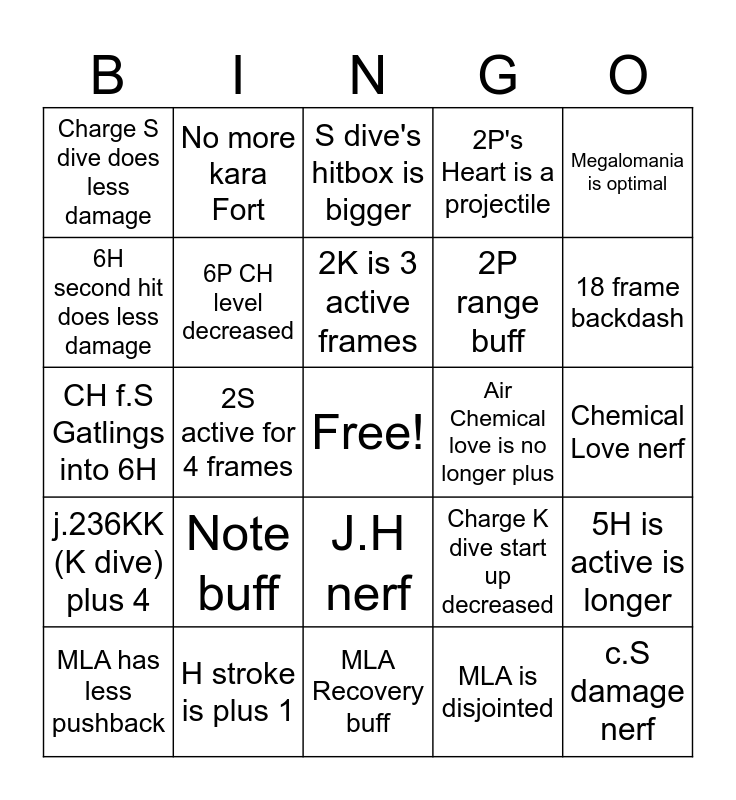 This bingo card has a free space and 24 words: Note buff, H stroke is plus 1, 2K is 3 active frames, MLA has less pushback, Megalomania is optimal, Charge S dive does less damage, 6H second hit does less damage, No more kara Fort, Air Chemical love is no longer plus, J.H nerf, 2P range buff, CH f.S Gatlings into 6H, Charge K dive start up decreased, 5H is active is longer, 6P CH level decreased, MLA is disjointed, Chemical Love nerf, S dive's hitbox is bigger, 18 frame backdash, 2S active for 4 frames, c.S damage nerf, j.236KK (K dive) plus 4, 2P's Heart is a projectile and MLA Recovery buff.