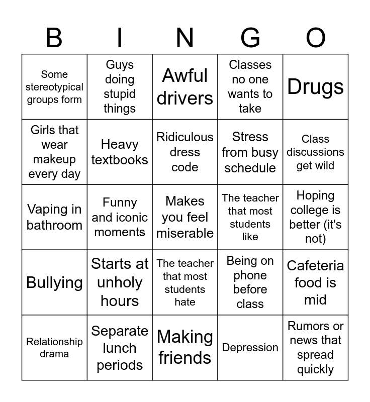 This bingo card has a free space and 24 words: Starts at unholy hours, Separate lunch periods, Ridiculous dress code, Relationship drama, Drugs, Some stereotypical groups form, Girls that wear makeup every day, Guys doing stupid things, The teacher that most students like, The teacher that most students hate, Stress from busy schedule, Vaping in bathroom, Being on phone before class, Cafeteria food is mid, Heavy textbooks, Depression, Hoping college is better (it's not), Awful drivers, Class discussions get wild, Funny and iconic moments, Rumors or news that spread quickly, Bullying, Classes no one wants to take and Making friends.