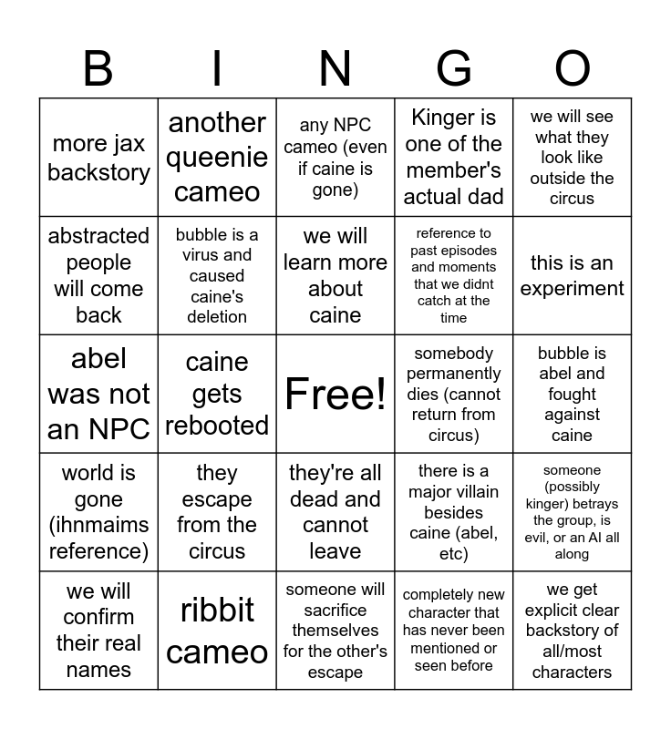 This bingo card has a free space and 24 words: they escape from the circus, ribbit cameo, we will learn more about caine, we will confirm their real names, we will see what they look like outside the circus, more jax backstory, abstracted people will come back, another queenie cameo, somebody permanently dies (cannot return from circus), they're all dead and cannot leave, reference to past episodes and moments that we didnt catch at the time, abel was not an NPC, there is a major villain besides caine (abel, etc), someone (possibly kinger) betrays the group, is evil, or an AI all along, bubble is a virus and caused caine's deletion, completely new character that has never been mentioned or seen before, bubble is abel and fought against caine, any NPC cameo (even if caine is gone), this is an experiment, caine gets rebooted, we get explicit clear backstory of all/most characters, world is gone (ihnmaims reference), Kinger is one of the member's actual dad and someone will sacrifice themselves for the other's escape.