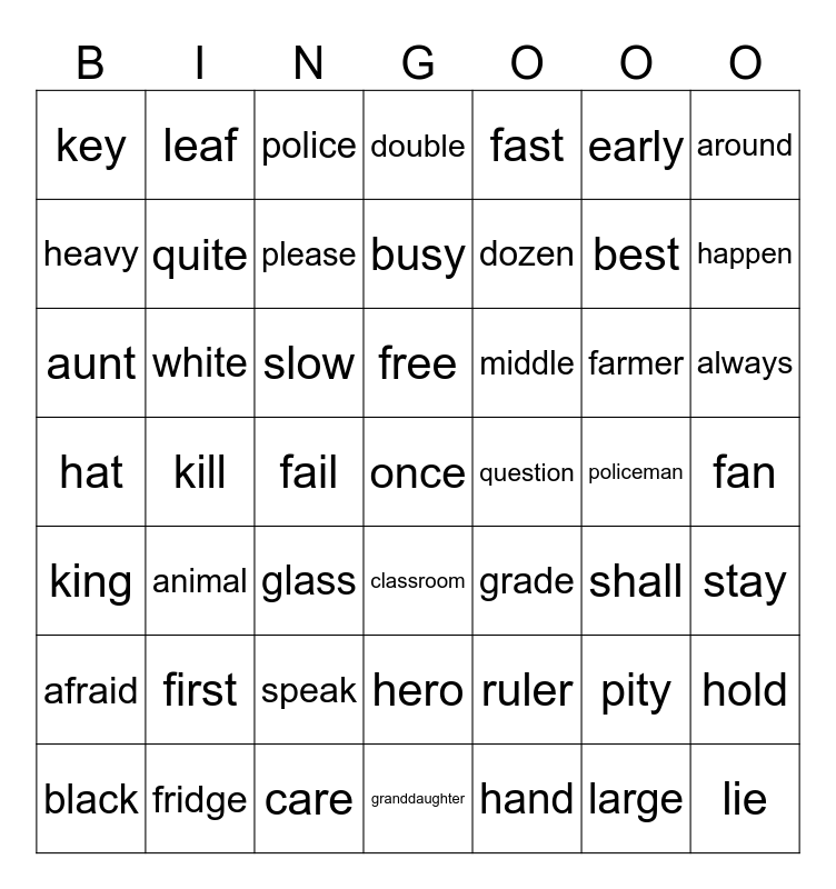 This bingo card has a free space and 48 words: ruler, best, granddaughter, kill, slow, fan, leaf, fridge, early, classroom, around, double, farmer, middle, afraid, policeman, heavy, happen, pity, fast, dozen, fail, key, quite, hold, please, always, black, free, white, large, question, stay, first, hat, grade, shall, aunt, glass, speak, king, lie, police, care, busy, hero, animal and hand.