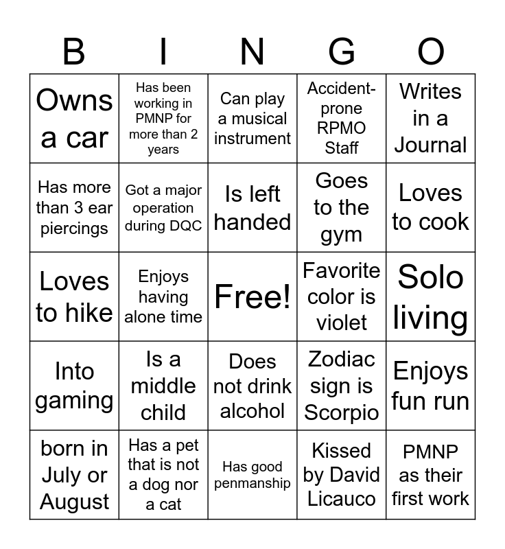 This bingo card has a free space and 24 words: Is a middle child, Has a pet that is not a dog nor a cat, Is left handed, born in July or August, Writes in a Journal, Owns a car, Has more than 3 ear piercings, Has been working in PMNP for more than 2 years, Favorite color is violet, Does not drink alcohol, Goes to the gym, Loves to hike, Zodiac sign is Scorpio, Enjoys fun run, Got a major operation during DQC, Kissed by David Licauco, Solo living, Can play a musical instrument, Loves to cook, Enjoys having alone time, PMNP as their first work, Into gaming, Accident-prone RPMO Staff and Has good penmanship.