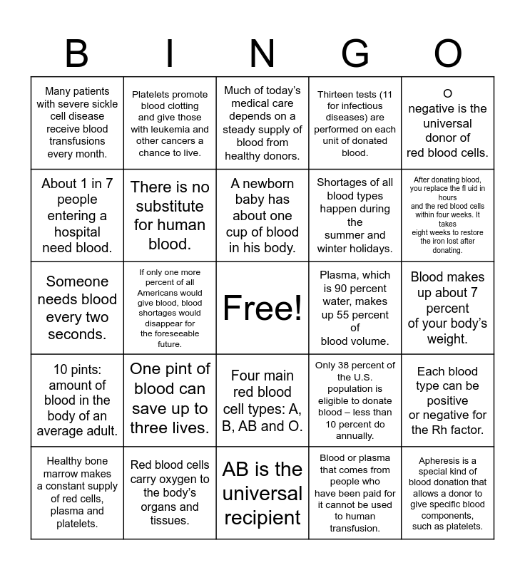 This bingo card has a free space and 24 words: One pint of blood can save up to three lives., Red blood cells carry oxygen to the body’s organs and tissues., A newborn baby has about one cup of blood in his body., Healthy bone marrow makes a constant supply of red cells, plasma and platelets., O negative is the universal donor of red blood cells., Many patients with severe sickle cell disease receive blood transfusions every month., About 1 in 7 people entering a hospital need blood., Platelets promote blood clotting and give those with leukemia and other cancers a chance to live., Plasma, which is 90 percent water, makes up 55 percent of blood volume., Four main red blood cell types: A, B, AB and O., Shortages of all blood types happen during the summer and winter holidays., Someone needs blood every two seconds., Only 38 percent of the U.S. population is eligible to donate blood – less than 10 percent do annually., Each blood type can be positive or negative for the Rh factor., There is no substitute for human blood., Blood or plasma that comes from people who have been paid for it cannot be used to human transfusion., Blood makes up about 7 percent of your body’s weight., Much of today’s medical care depends on a steady supply of blood from healthy donors., After donating blood, you replace the fl uid in hours and the red blood cells within four weeks. It takes eight weeks to restore the iron lost after donating., If only one more percent of all Americans would give blood, blood shortages would disappear for the foreseeable future., Apheresis is a special kind of blood donation that allows a donor to give specific blood components, such as platelets., 10 pints: amount of blood in the body of an average adult., Thirteen tests (11 for infectious diseases) are performed on each unit of donated blood. and AB is the universal recipient.