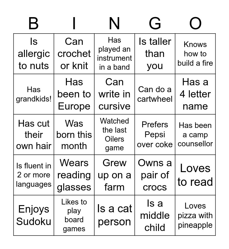 This bingo card has a free space and 24 words: Wears reading glasses, Likes to play board games, Can write in cursive, Enjoys Sudoku, Knows how to build a fire, Is allergic to nuts, Has grandkids!, Can crochet or knit, Prefers Pepsi over coke, Grew up on a farm, Can do a cartwheel, Has cut their own hair, Owns a pair of crocs, Loves to read, Has been to Europe, Is a middle child, Has been a camp counsellor, Has played an instrument in a band, Has a 4 letter name, Was born this month, Loves pizza with pineapple, Is fluent in 2 or more languages, Is taller than you and Is a cat person.