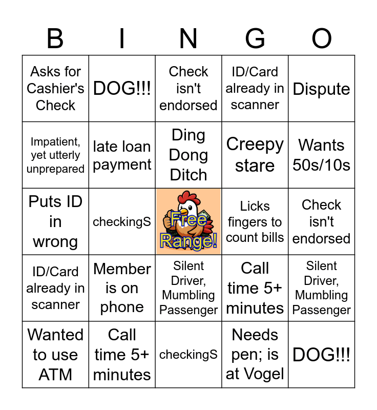 This bingo card has a free space and 44 words: Wants 50s/10s, DOG!!!, Wind go WHOOSH, Wanted to use ATM, Asks for Cashier's Check, Needs pen; is at Vogel, Check isn't endorsed, Stale/Expired Check, Dispute, Call time 5+ minutes, ID/Card already in scanner, Licks fingers to count bills, Silent Driver, Mumbling Passenger, Member is on phone, Doesn't take cash in time, checkingS, Machine out of 100s, Puts ID in wrong, Ignores the "pull the card back out" part, Wants 50s/10s, DOG!!!, Wind go WHOOSH, Wanted to use ATM, Asks for Cashier's Check, Needs pen; is at Vogel, Check isn't endorsed, Stale/Expired Check, Dispute, Call time 5+ minutes, ID/Card already in scanner, Licks fingers to count bills, Silent Driver, Mumbling Passenger, Member is on phone, Doesn't take cash in time, checkingS, Machine out of 100s, Puts ID in wrong, Ignores the "pull the card back out" part, Ding Dong Ditch, Impatient, yet utterly unprepared, Creepy stare, Wants statements, late loan payment and Thinks ATMs dispense envelopes, somehow.