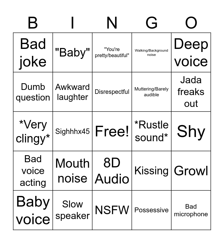 This bingo card has a free space and 24 words: Mouth noise, Slow speaker, Disrespectful, Baby voice, Deep voice, Bad joke, Dumb question, "Baby", *Rustle sound*, 8D Audio, Muttering/Barely audible, *Very clingy*, Kissing, Growl, Awkward laughter, Possessive, Shy, "You're pretty/beautiful", Jada freaks out, Sighhhx45, Bad microphone, Bad voice acting, Walking/Background noise and NSFW.