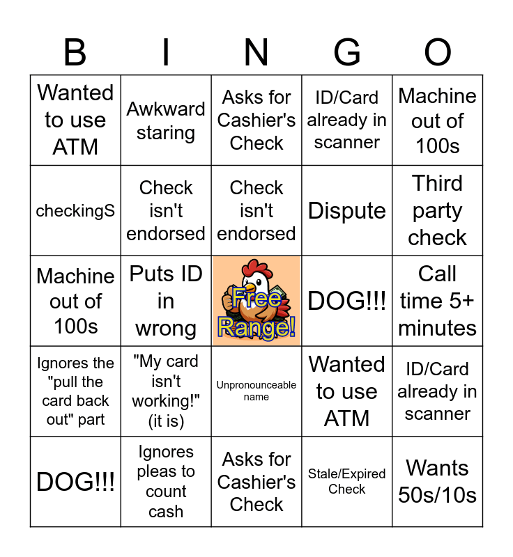 This bingo card has a free space and 55 words: Wants 50s/10s, DOG!!!, Wind go WHOOSH, Wanted to use ATM, Asks for Cashier's Check, Needs pen; is at Vogel, Check isn't endorsed, Stale/Expired Check, Dispute, Call time 5+ minutes, ID/Card already in scanner, Licks fingers to count bills, Silent Driver, Mumbling Passenger, Member is on phone, Doesn't take cash in time, checkingS, Machine out of 100s, Puts ID in wrong, Ignores the "pull the card back out" part, Wants 50s/10s, DOG!!!, Wind go WHOOSH, Wanted to use ATM, Asks for Cashier's Check, Needs pen; is at Vogel, Check isn't endorsed, Stale/Expired Check, Dispute, Call time 5+ minutes, ID/Card already in scanner, Licks fingers to count bills, Silent Driver, Mumbling Passenger, Member is on phone, Doesn't take cash in time, checkingS, Machine out of 100s, Puts ID in wrong, Ignores the "pull the card back out" part, Ding Dong Ditch, Impatient, yet utterly unprepared, Awkward staring, Wants statements, late loan payment, Thinks ATMs dispense envelopes, somehow, "My card isn't working!" (it is), Ignores pleas to count cash, Driver and passenger arguing, Large Deposit Hold, Number Box/Legal Line Mismatch, Third party check, Wants balance, but not on share, "Where are you?", Starts to talk after End Call pushed., Unpronounceable name and Oversharing.