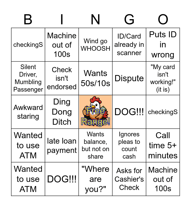 This bingo card has a free space and 62 words: Wants 50s/10s, DOG!!!, Wind go WHOOSH, Wanted to use ATM, Asks for Cashier's Check, Needs pen; is at Vogel, Check isn't endorsed, Stale/Expired Check, Dispute, Call time 5+ minutes, ID/Card already in scanner, Licks fingers to count bills, Silent Driver, Mumbling Passenger, Member is on phone, Doesn't take cash in time, checkingS, Machine out of 100s, Puts ID in wrong, Ignores the "pull the card back out" part, Wants 50s/10s, DOG!!!, Wind go WHOOSH, Wanted to use ATM, Asks for Cashier's Check, Needs pen; is at Vogel, Check isn't endorsed, Stale/Expired Check, Dispute, Call time 5+ minutes, ID/Card already in scanner, Licks fingers to count bills, Silent Driver, Mumbling Passenger, Member is on phone, Doesn't take cash in time, checkingS, Machine out of 100s, Puts ID in wrong, Ignores the "pull the card back out" part, Ding Dong Ditch, Impatient, yet utterly unprepared, Awkward staring, Wants statements, late loan payment, Thinks ATMs dispense envelopes, somehow, "My card isn't working!" (it is), Ignores pleas to count cash, Driver and passenger arguing, Large Deposit Hold, Number Box/Legal Line Mismatch, Third party check, Wants balance, but not on share, "Where are you?", Starts to talk after End Call pushed., Unpronounceable name, Oversharing, Mumble, Mumble, Grumpy about verifying, Wall of Comments!!!, CALL LENDING RES, Override for Amount, Wants more than 5k and Doesn't stack checks after asked to.