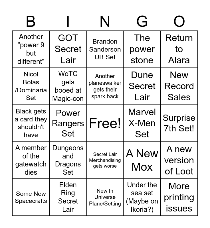 This bingo card has a free space and 24 words: Dungeons and Dragons Set, Elden Ring Secret Lair, Another planeswalker gets their spark back, Some New Spacecrafts, Return to Alara, Another "power 9 but different", Nicol Bolas /Dominaria Set, GOT Secret Lair, Marvel X-Men Set, Secret Lair Merchandising gets worse, Dune Secret Lair, Black gets a card they shouldn't have, A New Mox, A new version of Loot, WoTC gets booed at Magic-con, Under the sea set (Maybe on Ikoria?), Surprise 7th Set!, Brandon Sanderson UB Set, New Record Sales, Power Rangers Set, More printing issues, A member of the gatewatch dies, The power stone and New In Universe Plane/Setting.