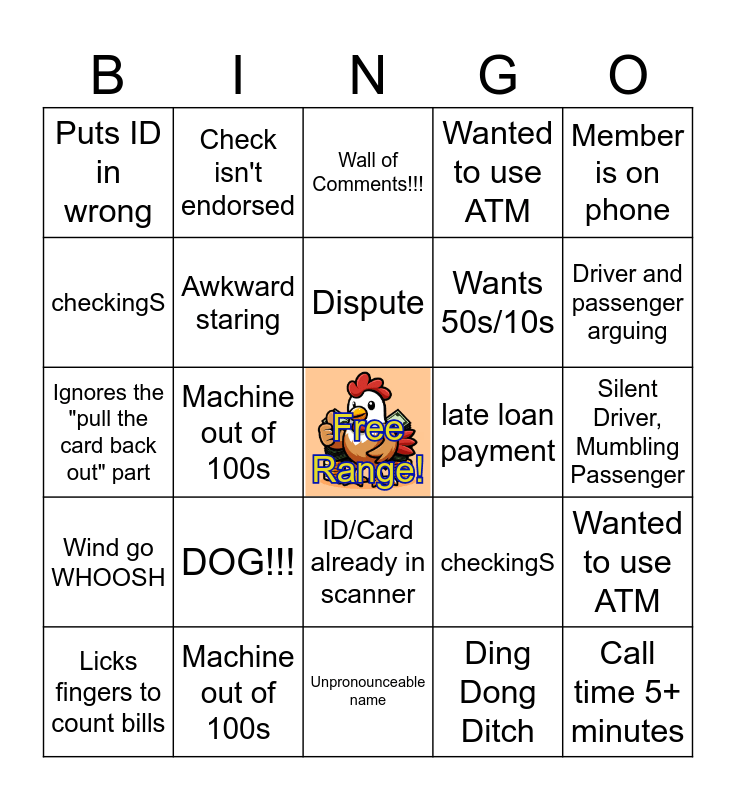 This bingo card has a free space and 65 words: Wants 50s/10s, DOG!!!, Wind go WHOOSH, Wanted to use ATM, Asks for Cashier's Check, Needs pen; is at Vogel, Check isn't endorsed, Stale/Expired Check, Dispute, Call time 5+ minutes, ID/Card already in scanner, Licks fingers to count bills, Silent Driver, Mumbling Passenger, Member is on phone, Doesn't take cash in time, checkingS, Machine out of 100s, Puts ID in wrong, Ignores the "pull the card back out" part, Wants 50s/10s, DOG!!!, Wind go WHOOSH, Wanted to use ATM, Asks for Cashier's Check, Needs pen; is at Vogel, Check isn't endorsed, Stale/Expired Check, Dispute, Call time 5+ minutes, ID/Card already in scanner, Licks fingers to count bills, Silent Driver, Mumbling Passenger, Member is on phone, Doesn't take cash in time, checkingS, Machine out of 100s, Puts ID in wrong, Ignores the "pull the card back out" part, Ding Dong Ditch, Impatient, yet utterly unprepared, Awkward staring, Wants statements, late loan payment, Thinks ATMs dispense envelopes, somehow, "My card isn't working!" (it is), Ignores pleas to count cash, Driver and passenger arguing, Large Deposit Hold, Number Box/Legal Line Mismatch, Third party check, Wants balance, but isn't on share, "Where are you?", Starts to talk after End Call pushed., Unpronounceable name, Oversharing, Mumble, Mumble, Grumpy about verifying, Wall of Comments!!!, CALL LENDING RES, Override for Amount, Wants more than 5k, Doesn't stack checks after asked to, Receipt Printer Jam, Gargantuan stack of bills and ONUS check would overdraw account.