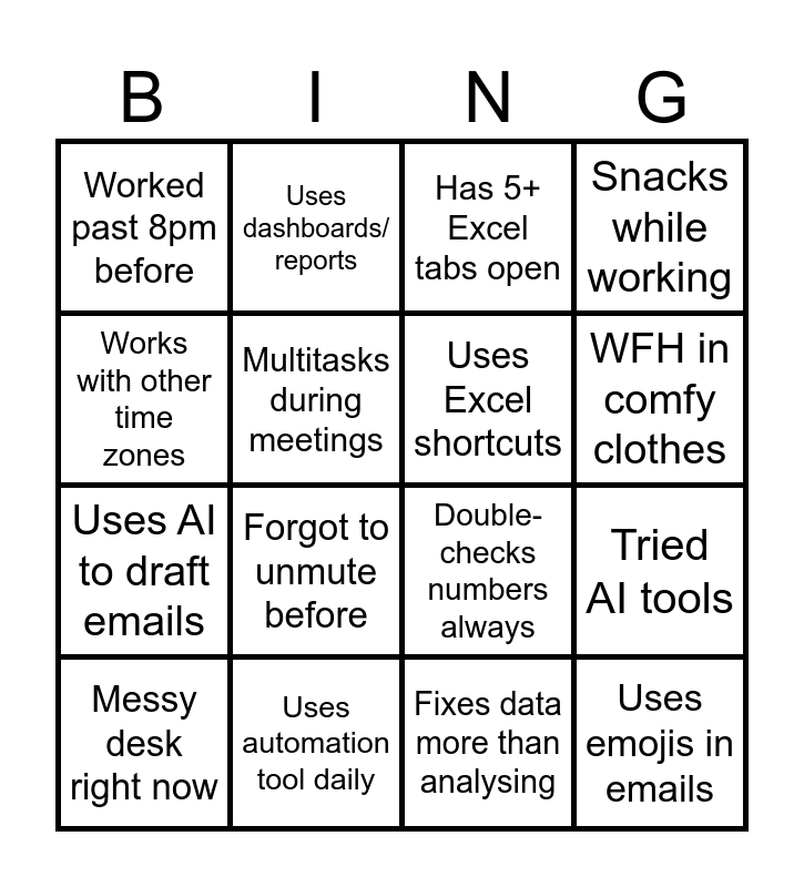 This bingo card has 16 words: Uses automation tool daily, Tried AI tools, Has 5+ Excel tabs open, Worked past 8pm before, Uses AI to draft emails, Uses dashboards/ reports, Double-checks numbers always, Fixes data more than analysing, Works with other time zones, Multitasks during meetings, Messy desk right now, Snacks while working, Forgot to unmute before, WFH in comfy clothes, Uses Excel shortcuts and Uses emojis in emails.