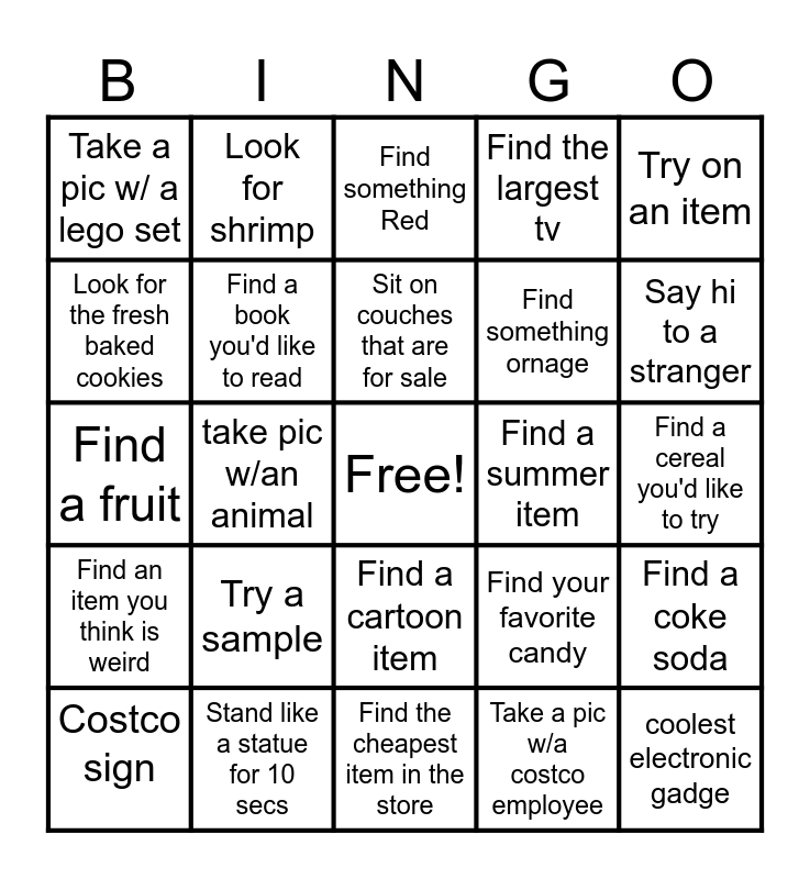 This bingo card has a free space and 24 words: Costco sign, Try a sample, Sit on couches that are for sale, Take a pic w/a costco employee, Try on an item, Take a pic w/ a lego set, Look for shrimp, Find something Red, Find a summer item, Find a cereal you'd like to try, Find a fruit, Find a book you'd like to read, Find your favorite candy, Find a coke soda, Look for the fresh baked cookies, Stand like a statue for 10 secs, Find the cheapest item in the store, Find the largest tv, Say hi to a stranger, Find an item you think is weird, take pic w/an animal, Find a cartoon item, Find something ornage and coolest electronic gadge.