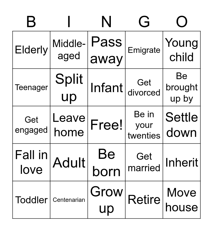 This bingo card has a free space and 24 words: Adult, Centenarian, Infant, Toddler, Young child, Elderly, Teenager, Middle-aged, Be in your twenties, Be born, Get divorced, Get engaged, Get married, Inherit, Split up, Retire, Settle down, Pass away, Be brought up by, Leave home, Move house, Fall in love, Emigrate and Grow up.