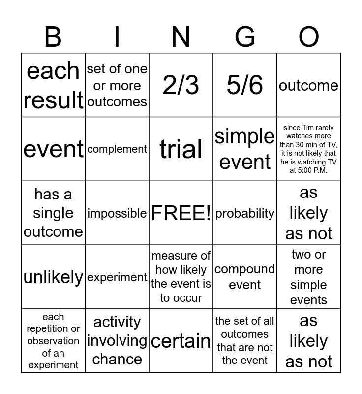 This bingo card has a free space and 24 words: experiment, activity involving chance, trial, each repetition or observation of an experiment, outcome, each result, event, set of one or more outcomes, probability, measure of how likely the event is to occur, simple event, has a single outcome, compound event, two or more simple events, complement, the set of all outcomes that are not the event, as likely as not, 2/3, since Tim rarely watches more than 30 min of TV, it is not likely that he is watching TV at 5:00 P.M., impossible, as likely as not, unlikely, 5/6 and certain.