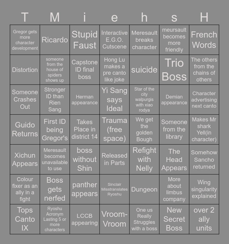This bingo card has a free space and 48 words: Dungeon, Trio Boss, Vroom-Vroom, First ID being Gregor's, Herman appearance, Makes Mr shark Yell(in character), Ricardo, Ryoshu Acronym Lasting 5 or more characters, meursault becomes more friendly, Released in Parts, French Words, Interactive E.G.O. Cutscene, Demian appearance, Star of the city walpurgis with xiao rodya, Colour fixer as an ally in a fight, Someone from the library, Distortion, The others from the chains of others, More about limbus company, Meresault breaks character, suicide, Takes Place in district 14, Gregor gets more character development, someone from the house of spiders shows up, Wing singularity explained, Capstone ID final boss, Character advertising next canto, Tops Canto IX, Yi Sang says Ideal, Stronger ID than Rien Sang, New Secret Boss, We get the golden Bough, Somehow Sancho returned, Boss gets nerfed, Guido Returns, Refight with Nelly, The Head Appears, Someone Crashes Out, boss without Shin, panther appears, Xichun Appears, over 2 ally units, Stupid Faust, LCCB appearing, Hong Lu makes a pre canto like joke, Sinclair Misstranslates Ryoshu, Meresault becomes unavailable to use and One us Really Struggles with a boss.