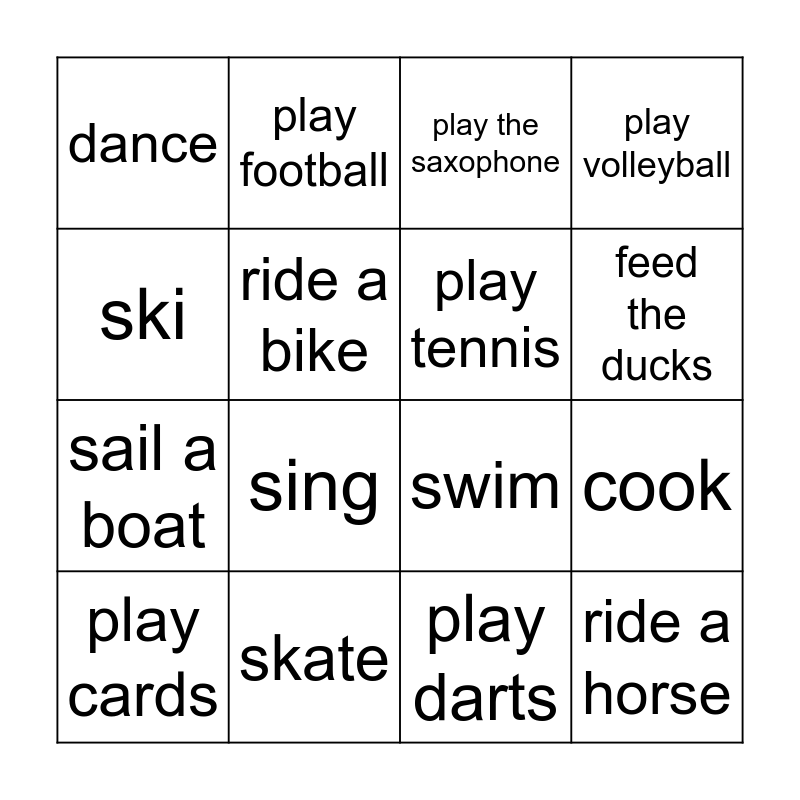 This bingo card has 16 words: skate, cook, play the saxophone, dance, sail a boat, play football, swim, play darts, ski, ride a bike, play cards, play volleyball, sing, feed the ducks, play tennis and ride a horse.