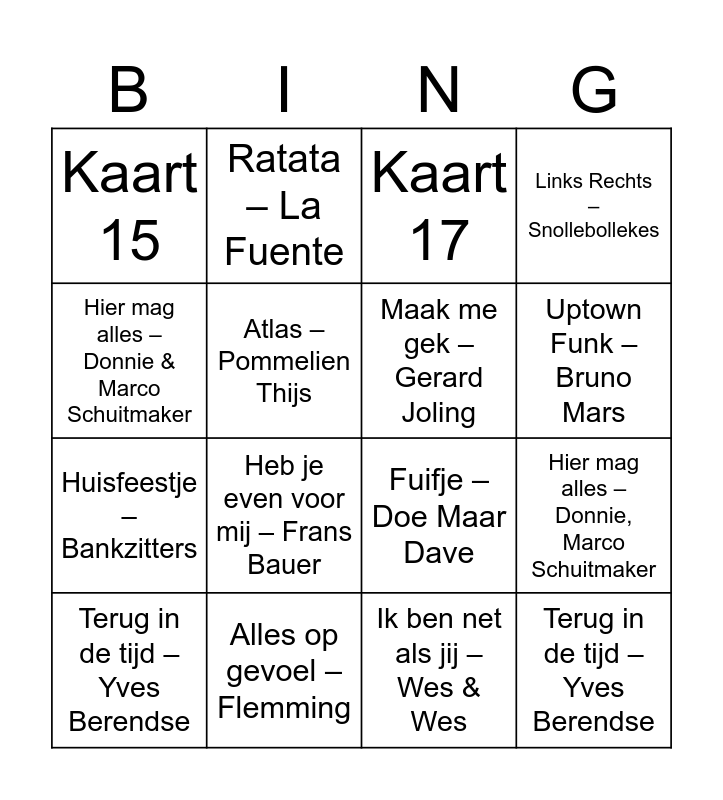 ⚠ This card has duplicate items: Golden – KPop (8), Gi-Ga-Groen – Kinderen voor Kinderen (5), Dromendans – Vinzzent (4), Zoet, zout, zuur – Robert van Hemert (6), C'est la vie – Claude (8), Ratata – La Fuente (8), Sexy als ik dans – Nielson (6), Uptown Funk – Bruno Mars (7), Brabant – Guus Meeuwis (8), Links Rechts – Snollebollekes (8), Okido – Kinderen voor Kinderen (8), Dura – Daddy Yankee (6), Atlas – Pommelien Thijs (8), Tranquilo – Jan Smit (8), Maak me gek – Gerard Joling (10), Fuifje – Doe Maar Dave (6), Per Spoor – Guus Meeuwis (8), Vrouwkes – Snollebollekes (8), Heb je even voor mij – Frans Bauer (8), Bagagedrager – Gers Pardoel (8), Duurt te lang – Davina Michelle (8), Alles op gevoel – Flemming (8), Ik ben net als jij – Wes & Wes (7), Zin in jou – Yves Berendse (8), Boevenpad – Bankzitters (8), Huisfeestje – Bankzitters, Roxy Dekker (3), Amalia – Wesly Bronkhorst (8), Blikkendag – Sven Versteeg (8), Ken je dat gevoel – Suzan & Freek (8), Baila de Gasolina – Effe Serieus (7), Hier mag alles – Donnie, Marco Schuitmaker (3), Terug in de tijd – Yves Berendse (7), Europapa – Joost (3), DNA – Eindhoven's Finest (6), Huisfeestje – Bankzitters (5), Hier mag alles – Donnie & Marco Schuitmaker (5), Echte liefde is te koop – Samuel Welten (2), Ferry de Roze Flamnigo – Barry Fest (2), Alle kleuren – K3 (2)