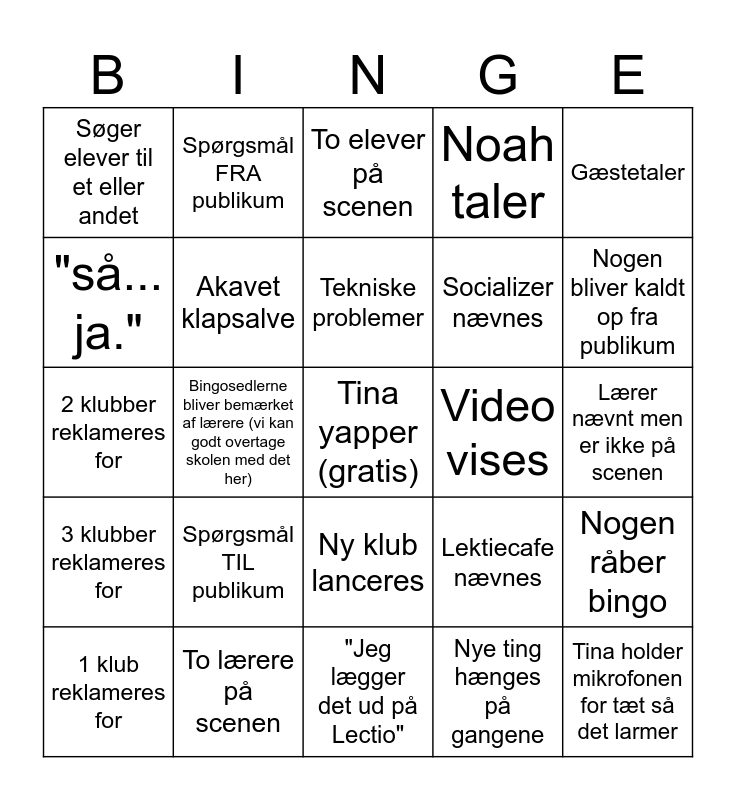 This bingo card has a free space and 24 words: Spørgsmål TIL publikum, To lærere på scenen, Tekniske problemer, 1 klub reklameres for, Gæstetaler, Søger elever til et eller andet, "så... ja.", Spørgsmål FRA publikum, Video vises, Ny klub lanceres, Socializer nævnes, 2 klubber reklameres for, Lektiecafe nævnes, Nogen råber bingo, Akavet klapsalve, Nye ting hænges på gangene, Lærer nævnt men er ikke på scenen, To elever på scenen, Nogen bliver kaldt op fra publikum, Bingosedlerne bliver bemærket af lærere (vi kan godt overtage skolen med det her), Tina holder mikrofonen for tæt så det larmer, 3 klubber reklameres for, Noah taler and "Jeg lægger det ud på Lectio".
