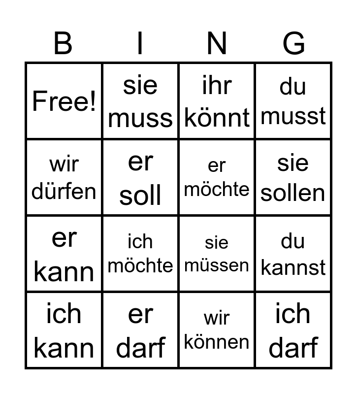 This bingo card has 16 words: ich kann, er darf, ihr könnt, du musst, wir dürfen, sie muss, sie müssen, du kannst, Free!, er soll, wir können, sie sollen, er kann, ich möchte, er möchte and ich darf.