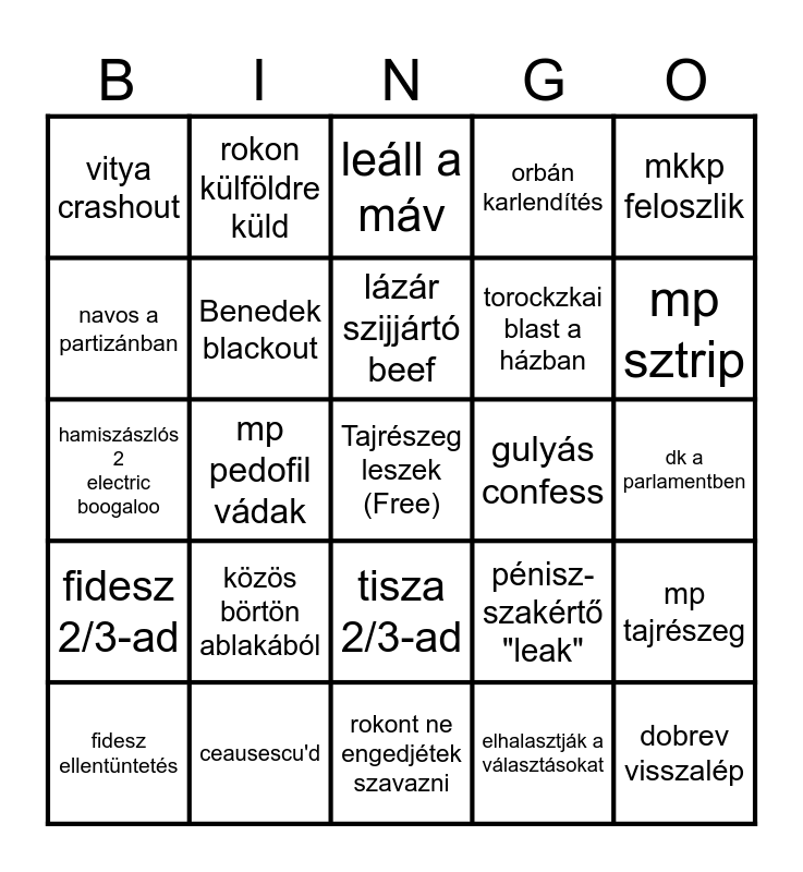 This bingo card has a free space and 24 words: közös börtön ablakából, ceausescu'd, lázár szijjártó beef, fidesz ellentüntetés, mkkp feloszlik, vitya crashout, navos a partizánban, rokon külföldre küld, gulyás confess, tisza 2/3-ad, torockzkai blast a házban, hamiszászlós 2 electric boogaloo, pénisz-szakértő "leak", mp tajrészeg, Benedek blackout, elhalasztják a választásokat, dk a parlamentben, leáll a máv, mp sztrip, mp pedofil vádak, dobrev visszalép, fidesz 2/3-ad, orbán karlendítés and rokont ne engedjétek szavazni.