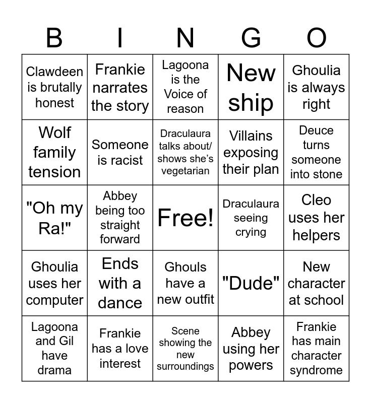 This bingo card has a free space and 24 words: Ends with a dance, Frankie has a love interest, Draculaura talks about/ shows she’s vegetarian, Lagoona and Gil have drama, Ghoulia is always right, Clawdeen is brutally honest, Wolf family tension, Frankie narrates the story, Draculaura seeing crying, Ghouls have a new outfit, Villains exposing their plan, "Oh my Ra!", "Dude", New character at school, Someone is racist, Abbey using her powers, Cleo uses her helpers, Lagoona is the Voice of reason, Deuce turns someone into stone, Abbey being too straight forward, Frankie has main character syndrome, Ghoulia uses her computer, New ship and Scene showing the new surroundings.