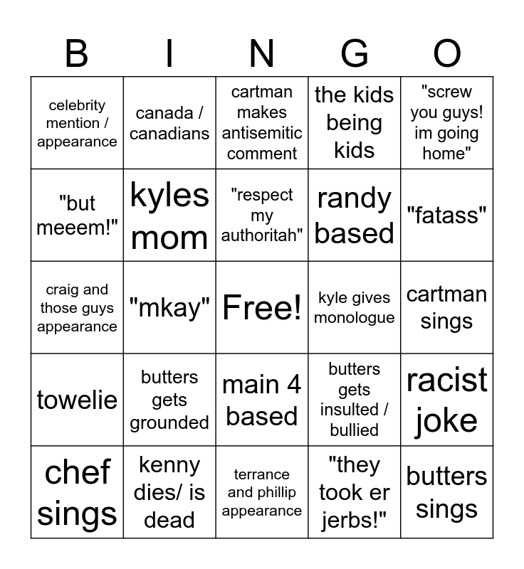This bingo card has a free space and 24 words: butters gets grounded, kenny dies/ is dead, "respect my authoritah", chef sings, "screw you guys! im going home", celebrity mention / appearance, "but meeem!", canada / canadians, kyle gives monologue, main 4 based, randy based, craig and those guys appearance, butters gets insulted / bullied, racist joke, kyles mom, "they took er jerbs!", cartman sings, cartman makes antisemitic comment, "fatass", "mkay", butters sings, towelie, the kids being kids and terrance and phillip appearance.