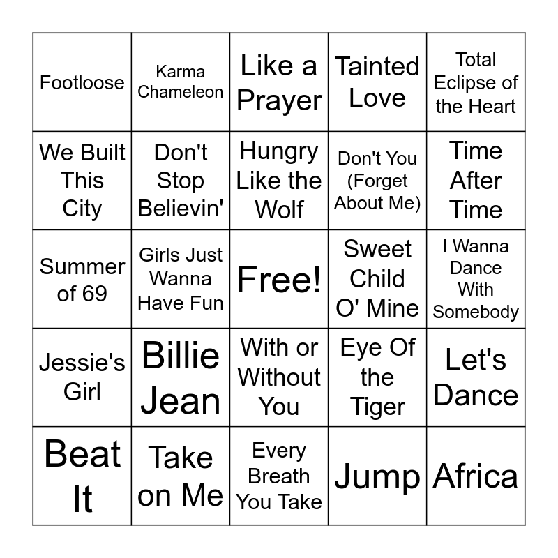 This bingo card has a free space and 29 words: Beat It, Wake Me Up Before You Go-Go, Girls Just Wanna Have Fun, Pour Some Sugar on Me, Footloose, Like a Prayer, Don't Stop Believin', Billie Jean, Sweet Child O' Mine, Take on Me, I Wanna Dance With Somebody, Africa, Every Breath You Take, Jump, Time After Time, Another One Bites The Dust, With or Without You, Jessie's Girl, Total Eclipse of the Heart, Summer of 69, Eye Of the Tiger, Faith, Don't You (Forget About Me), We Built This City, Tainted Love, Karma Chameleon, Let's Dance, Hungry Like the Wolf and Power of Love.