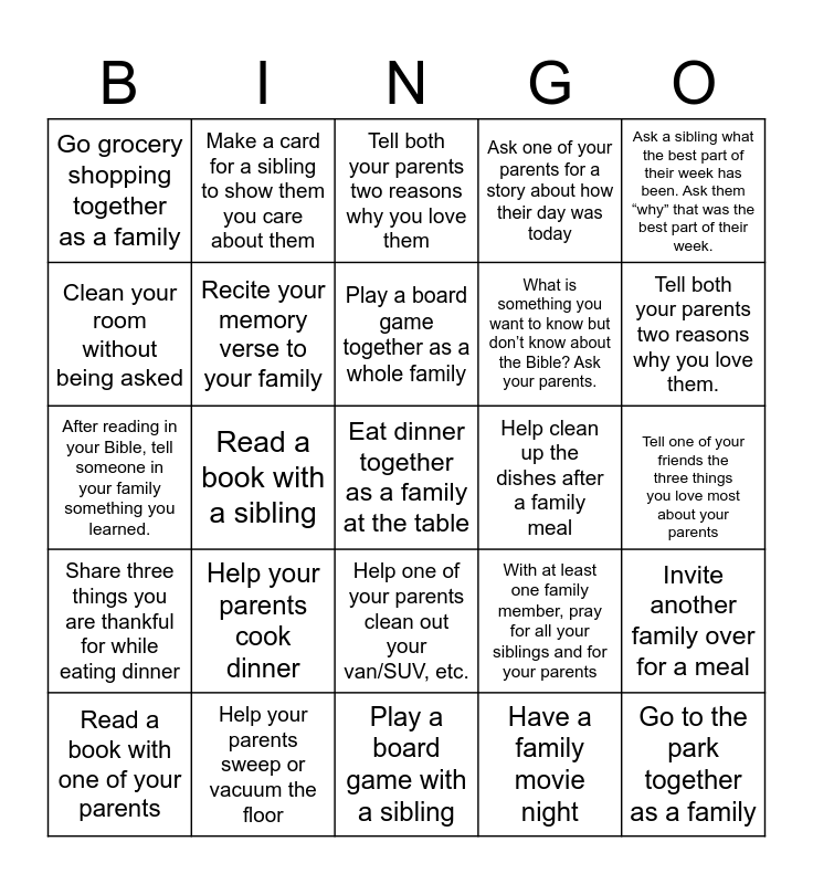 This bingo card has a free space and 24 words: Help your parents cook dinner, Help your parents sweep or vacuum the floor, Play a board game together as a whole family, Read a book with one of your parents, Ask a sibling what the best part of their week has been. Ask them “why” that was the best part of their week., Go grocery shopping together as a family, Clean your room without being asked, Make a card for a sibling to show them you care about them, Help clean up the dishes after a family meal, Help one of your parents clean out your van/SUV, etc., What is something you want to know but don’t know about the Bible? Ask your parents., After reading in your Bible, tell someone in your family something you learned., With at least one family member, pray for all your siblings and for your parents, Invite another family over for a meal, Recite your memory verse to your family, Have a family movie night, Tell one of your friends the three things you love most about your parents, Tell both your parents two reasons why you love them, Tell both your parents two reasons why you love them., Read a book with a sibling, Go to the park together as a family, Share three things you are thankful for while eating dinner, Ask one of your parents for a story about how their day was today and Play a board game with a sibling.