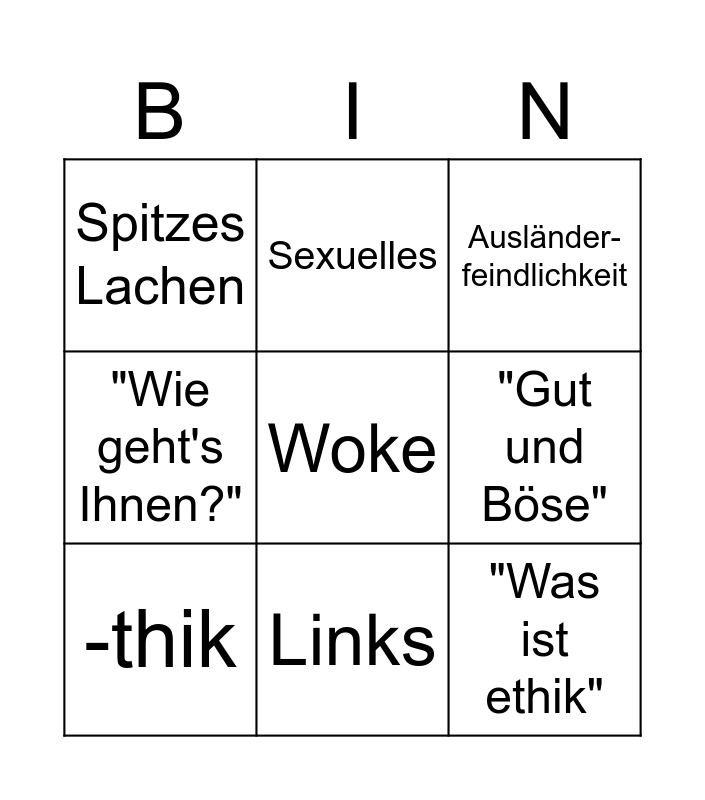 This bingo card has a free space and 8 words: "Gut und Böse", Ausländer- feindlichkeit, Sexuelles, -thik, Spitzes Lachen, "Was ist ethik", "Wie geht's Ihnen?" and Links.