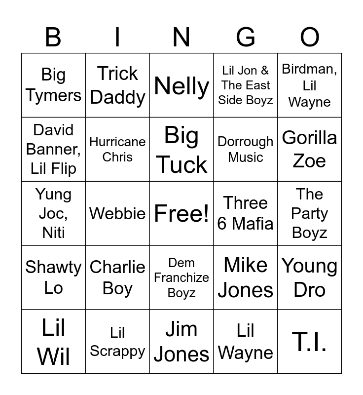 This bingo card has a free space and 24 words: Charlie Boy, Lil Scrappy, Big Tuck, Lil Wil, Birdman, Lil Wayne, Big Tymers, David Banner, Lil Flip, Trick Daddy, Three 6 Mafia, Dem Franchize Boyz, Dorrough Music, Yung Joc, Niti, Mike Jones, Young Dro, Hurricane Chris, Lil Wayne, The Party Boyz, Nelly, Gorilla Zoe, Webbie, T.I., Shawty Lo, Lil Jon & The East Side Boyz and Jim Jones.