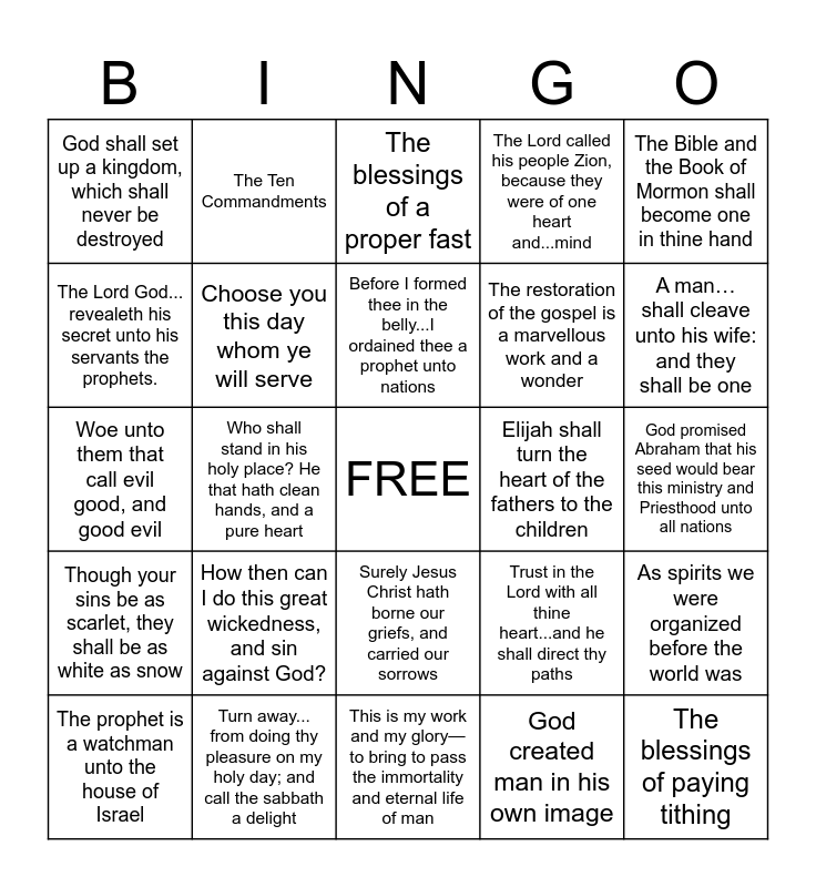 This bingo card has a free space and 24 words: How then can I do this great wickedness, and sin against God?, Turn away... from doing thy pleasure on my holy day; and call the sabbath a delight, Before I formed thee in the belly...I ordained thee a prophet unto nations, The prophet is a watchman unto the house of Israel, The Bible and the Book of Mormon shall become one in thine hand, God shall set up a kingdom, which shall never be destroyed, The Lord God... revealeth his secret unto his servants the prophets., The Ten Commandments, Elijah shall turn the heart of the fathers to the children, Surely Jesus Christ hath borne our griefs, and carried our sorrows, The restoration of the gospel is a marvellous work and a wonder, Woe unto them that call evil good, and good evil, Trust in the Lord with all thine heart...and he shall direct thy paths, As spirits we were organized before the world was, Choose you this day whom ye will serve, God created man in his own image, God promised Abraham that his seed would bear this ministry and Priesthood unto all nations, The blessings of a proper fast, A man…shall cleave unto his wife: and they shall be one, Who shall stand in his holy place? He that hath clean hands, and a pure heart, The blessings of paying tithing, Though your sins be as scarlet, they shall be as white as snow, The Lord called his people Zion, because they were of one heart and...mind and This is my work and my glory—to bring to pass the immortality and eternal life of man.