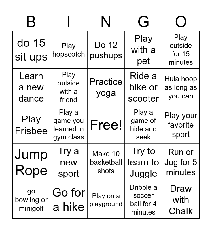 This bingo card has a free space and 24 words: Try a new sport, Go for a hike, Practice yoga, go bowling or minigolf, Play outside for 15 minutes, do 15 sit ups, Learn a new dance, Play hopscotch, Play a game of hide and seek, Make 10 basketball shots, Ride a bike or scooter, Play Frisbee, Try to learn to Juggle, Run or Jog for 5 minutes, Play outside with a friend, Dribble a soccer ball for 4 minutes, Play your favorite sport, Do 12 pushups, Hula hoop as long as you can, Play a game you learned in gym class, Draw with Chalk, Jump Rope, Play with a pet and Play on a playground.