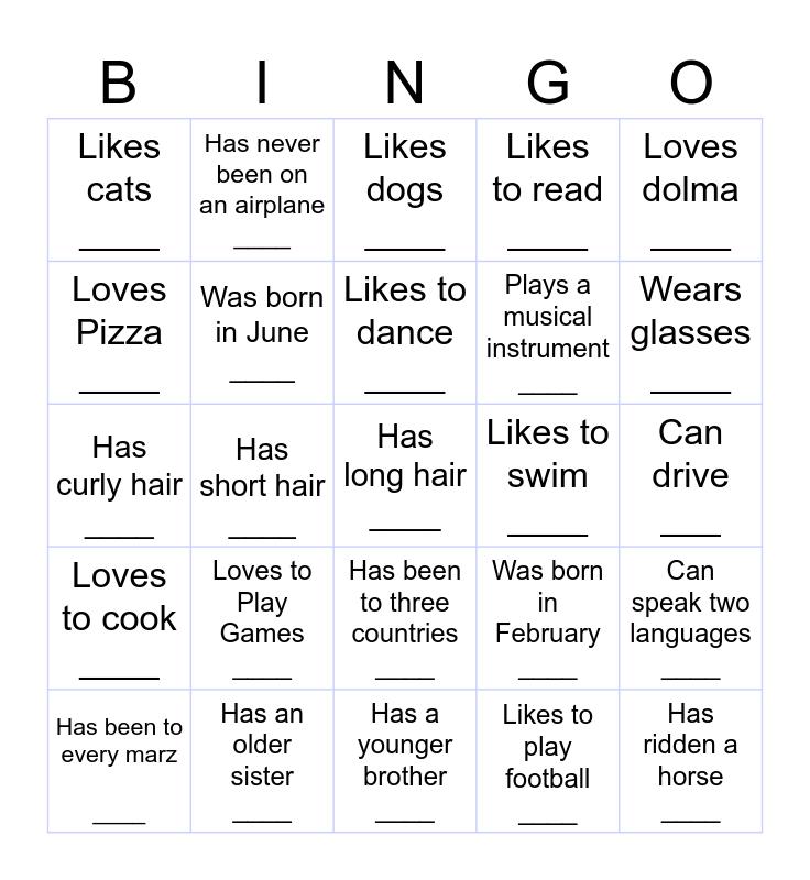 This bingo card has 25 words: Loves to Play Games ____, Has a younger brother ____, Likes to dance ____, Has been to every marz ____, Loves dolma ____, Likes cats ____, Loves Pizza ____, Has never been on an airplane ____, Likes to swim ____, Has been to three countries ____, Plays a musical instrument ____, Has curly hair ____, Was born in February ____, Can speak two languages ____, Was born in June ____, Has ridden a horse ____, Can drive ___, Likes dogs ____, Wears glasses ____, Has short hair ____, Has long hair ____, Has an older sister ____, Loves to cook ____, Likes to read ____ and Likes to play football ____.