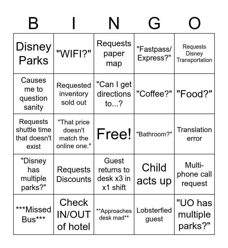 This bingo card has a free space and 24 words: Requests Discounts, Check IN/OUT of hotel, "Can I get directions to...?, ***Missed Bus***, Requests Disney Transportation, Disney Parks, Causes me to question sanity, "WIFI?", "Bathroom?", Guest returns to desk x3 in x1 shift, "Coffee?", Requests shuttle time that doesn't exist, Child acts up, Multi-phone call request, Requested inventory sold out, Lobsterfied guest, Translation error, Requests paper map, "Food?", "That price doesn't match the online one.", "UO has multiple parks?", "Disney has multiple parks?", "Fastpass/ Express?" and **Approaches desk mad**.