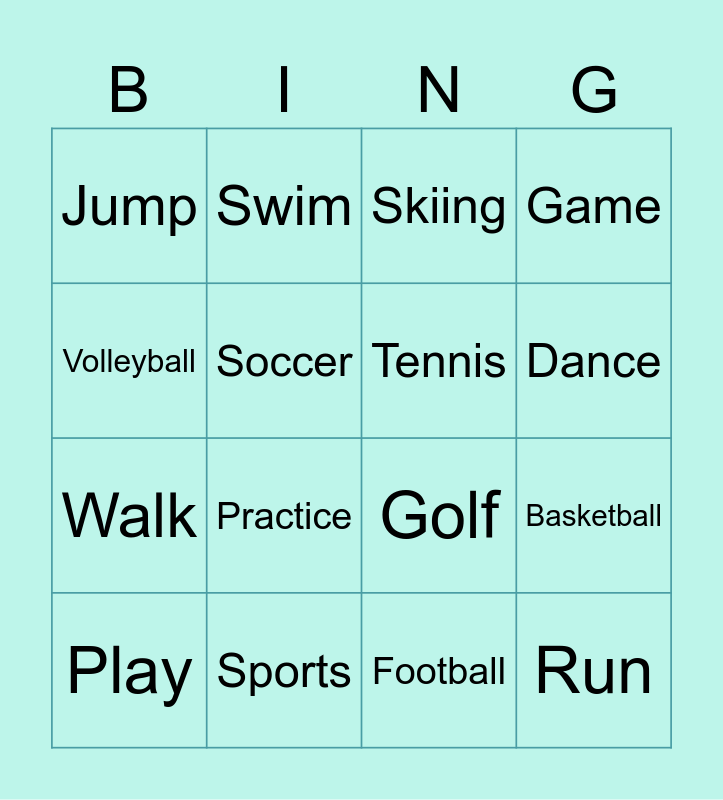 This bingo card has 18 words: Practice, Run, Skiing, Jump, Golf, Game, Play, Swim, Dance, Walk, Football, Volleyball, Basketball, Soccer, Tennis, Wrestling, Sports and Ice Skate.